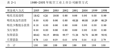 下表 2-1 顯示的是 1998 年至 2005 年我國航空工業公司在已上市公司中的融資方式以及地區的分布比例。從圖表中可以看出,我國航空工業行業上市公司的權益性融資多數是吸收性質的投資。但在 2001 年之后權益性融資減少直接融資途徑使用增多,負債性融資多為短期的借款,且目前已經達到融資規模的八成以上。一個國家想要加快工業化現代化的發展,航空工業無疑是推動其發展的先導產業,縱觀世界上許多發達的國家,多數都是通過發展航空工業將自身的工業化現代化發展起來的。據不完全統計,在全球范圍內有超過 20%的國家都有獨立的航空航天基地,在數量和規模上各有差異,其航空企業的數量也日益增多。平均每年的營業收入在 2 000 億至 3 500 億美元之間。當前看來全球中北美西歐以及加拿大、俄羅斯等地區的航空航天工業較為發達,其中以美國最為發達占據了全球 60%多的營業收入。美國的航空航天業,發展如此之成功不僅在于其發展的規模巨大,還表明美國航空技術的完善發達。落眼于我國的航空航天產業,可以發現我國的航空軍工工業發展基礎尤為薄弱。自從改革開放以來,我國的航空航天技術從無到有逐漸發展起來,并做出了巨大的成績。截止到現在,我國的航空軍工企業已經鉆研探究出了各式各樣的新型軍用以及作業使用的機型,出口海內外達到了很大的數額。目前,完善齊全的中國航空行業體系已經初步形成,這也滿足了我國日益發展的社會需求。