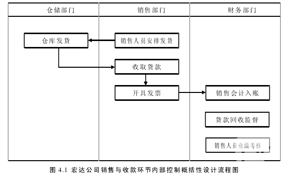 結合前述業務流程層面內部控制分析的銷售與收款、采購與付款、生產與存貨、人力資源與薪酬等評價點指標,選取企業生產經營活動中的重要業務環節的流程和控制作為突破點,評估人員通過日常下戶巡查掌握該企業的內部控制方面的情況信息,根據增值稅稅種特點,對宏達公司內部控制的有效性進行具體分析,增值稅主要涉及銷項稅額和進項稅額的計算,與之對應的內部控制分析可以主要針對銷售與收款、采購與付款、生產與存貨、人力資源薪酬等內部控制活動,根據宏達公司的實際情況,選取了部分與增值稅納稅申報關聯較大的內部控制情況進行分析,具體分析結果如下:該企業銷售環節各業務職能部門的職責和分工如下:銷售部門根據業務人員的要求安排倉庫發貨;發貨單掛銷售人員個人賬戶,并根據貨款回收情況對其銷售業績進行考核;以是否收到貨款作為開具發票的依據。倉庫部門按照銷售部門的要求發貨。財務部門根據銷售部門開具的發票收取貨款并作銷售入賬處理,同時負責對貨款的回收和業務人員的監督考核。月末三方進行對賬。通過對這一內控制度的分析,可以看出該企業對銷售收入實現的確認不是以權責發生制原則為依據,而是以是否收到貨款作為開具發票并計收入的依據,這一會計處理方法導致部分貨物銷售后未及時作收入,銷售環節的內部控制設計沒能有效的監控到銷售收入的及時入賬。銷售與收款環節內部控制的概括性流程見圖 4.1。