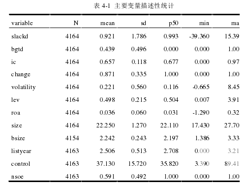 由上表 4-1 主要變量的描述性統計而知,從預算松弛程度看,slackd 均值和中位數分別為 0.921 和 0.993,說明采用潘飛(2008)對預算松弛的衡量方法,樣本中所選取的上市公司的營業收入增長率的預算值要比實際的行業平均營業收入增長率低了 7.2 個百分點,將近 10 個百分點,可見 2010 年-2015 年 A 股上市公司的預算松弛程度的狀況還是很嚴重的。從預算目標完成情況看,bgtd 均值和中位數分別為 0.439 和 0.496,說明在本文選取的樣本中有 43.9%的公司預算目標完成,但仍然有 56.1%的公司沒有完成上年末公司編制的預算收入的目標。從內部控制指數上看,在本文選取的樣本公司中內部控制指數的平均值為0.657,說明 2010 年-2015 年我國所有上市公司內部控制制度實施平均都很好,內部控制指數的標準差為 0.118,說明在本文選取的樣本公司中內部控制有效性的差異比較大。 在所有控制變量中,從公司規模上看,size 的平均值是 22.250,說明樣本中公司的平均規模為 46.03 億,從企業風險上看,Lev 的均值為 49.8%,從盈利能力上看,樣本中公司的 ROA 的均值為 3.6%,從企業性質上看,在樣本中我們發現有 40.9%的公司為民營企業。綜上,本文的樣本特征總體與以往的文獻基本一致。