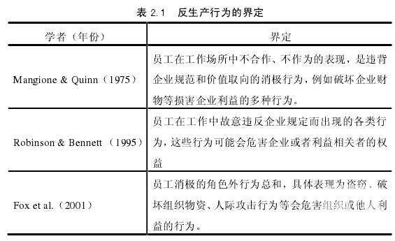結合以往關于工作場所內越軌行為的研究結果,Mangione  &  Quinn 在1975 年首次明確提出了反生產行為(Counterproductive  Workplace Behavior)的概念,并對其具體含義進行了嘗試性的界定。他們認為反生產行為主要是員工不合作、不作為的表現,是員工違背企業規范和價值取向的系列消極行為,并且能夠對企業利益造成不同程度的損害。盡管這一概念提出較早,但直到上世紀九十年代,隨著員工在工作場所內負面行為日益嚴峻,反生產行為才開始得到學術界的廣泛關注。其中,Robinson & Bennett(1995)的界定得到后來許多學者的認可和肯定,他們將反生產行為定義為員工在工作場所中故意違反企業相關規范而出現的各類負面行為,這些行為可能會危害企業或者利益相關者的權益。該界定體現了反生產行為三方面的主要內涵:(1)該行為是員工主觀故意實施的;(2)該行為結果可能或者已經為組織帶來利益損害;(3)盡管行為結果可能為組織帶來某些潛在利益,但仍不足以彌補給組織造成的危害(Sackett & Devore,2001)。 此后眾多學者對反生產行為進行了多種界定,但基本都涵蓋了以上三方面的特征(Bordia et al.,2008;王琛、陳維政,2009)。還有學者在對反生產行為與組織公民行為的比較基礎上,認為反生產行為實質上是員工消極的角色外行為總和,這些行為可能在組織中沒有明確指出是否可以執行或禁止實施,其具體表現為怠工、盜竊、破壞組織物資、人際攻擊行為等會危害組織或他人利益的行為(Fox et al.,2001;張永軍等,2012)。我國學者基于中國本土化情境也對反生產行為進行了詳細研究與界定(張建衛、劉玉新,2009;劉文彬,2015)。這些界定內容基本都體現了反生產行為的故意性、危害性、違規性,具體界定匯總如表 2.1 所示。