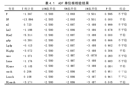 金融危機對于我國進出口貿易沖擊影響的傳導機制主要通過需求傳導與匯率傳導兩種方式進行,對于我國來說,美國居民失業率上升、收入減少以及財富縮水均可能導致進口需求的減少,此外,美國所實施的擴張性財政與貨幣政策,使得美元/人民幣匯率一度下降也會造成我國出口企業在產品價格上失去原有的競爭優勢,進而導致出口貿易額的減少。本文選取美國 GDP、貨幣供應量 M2、失業率以及美元/人民幣匯率四個指標刻畫金融危機期間美國經濟狀況所發生的變化。其中,美國 GDP 數據來源于美國商務部網站,貨幣供應量 M2 和美元/人民幣匯率數據來源于美聯儲網站,失業率數據來源于美國勞工部網站。數據采用了2002-2009 年月度數據,美國 GDP 數據只有季度數據,本文利用 Eviews6.0 統計分析軟件進行數據頻率轉換得到月度數據,所有數據在進行分析前均采用 X11方法進行了季節調整。 平穩性是時間序列分析的基礎9。檢查序列平穩性的主要方法有 DF 檢驗、ADF檢驗、PP 檢驗以及 KPSS 檢驗等。本文使用 ADF 檢驗(Augmented Dickey-Fuller Test)方法對變量我國進出口貿易綜合指數、美國 GDP、貨幣供應量 M2、失業率以及美元/人民幣匯率的時間序列進行單位根檢驗。