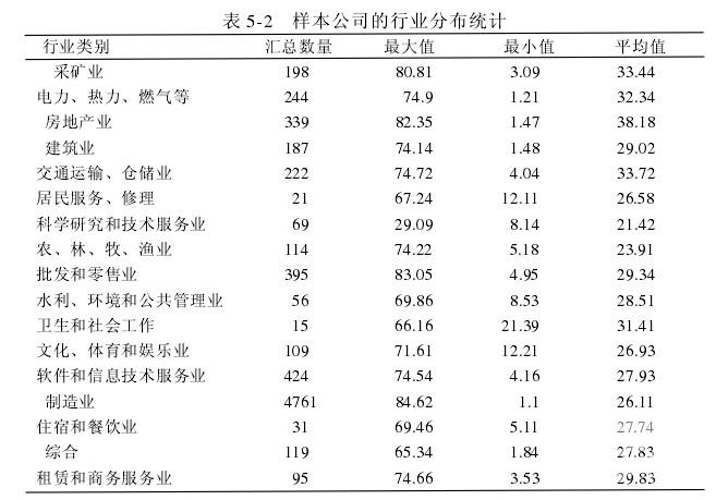 明現階段我國企業社會責任表現情況較差,還有許多值得改善的地方。 表 5-2 反映的是樣本公司的行業評分分布統計,可以看到不同行業在社會表現上呈現出不同的態勢:其中房地產業社會責任均值最高;其次,交通運輸、倉儲業、采礦業行業評分也很高,但具體各個行業的表現差別挺大;最后,各行業內的企業社會責任評分也分布不均,各企業社會責任得分差距仍較大。 表 5-3 對樣本公司按產權性質劃分,分為國有企業與非國有企業。從表中可以發現,國有企業的平均評分高于非國有企業,且標準差較小,說明國有企業在社會責任上的表現更好。 表 5-4 是對所有變量所進行的描述性統計,從中可以看出:首先,上市公司在社會責任的表現上具有相當的差異性,其中樣本公司中最高分為 84.62,而最低分僅為 1.1。而且,樣本公司社會責任平均得分為 27.67,標準差為 16.44,表