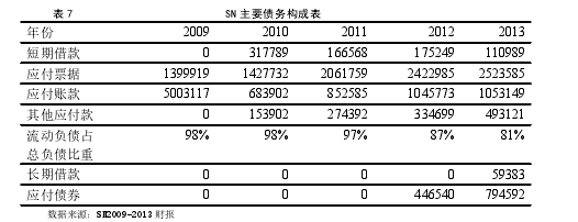 (1)SN 存在明顯的債務結構不合理的問題,在融資結構中負債大多數都是由應付賬款組成的,說明 SN 對占用供應商融資依賴程度較高,這種模式容易造成與上游供應商關系緊張,供應商與銷售企業是相輔相成的,與供應商關系惡劣對企業自身的發展也有不好的影響.