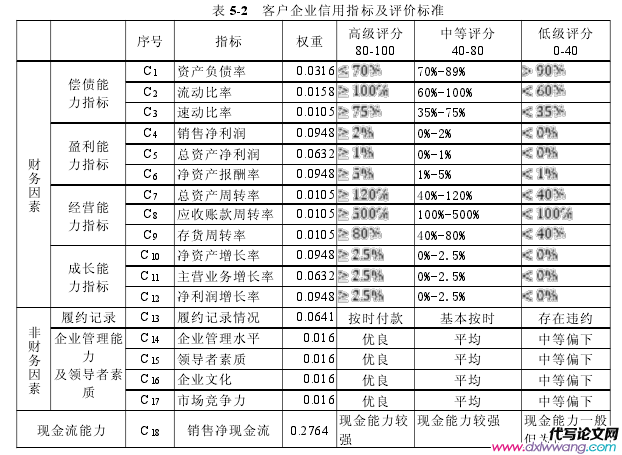 T 化工企業的客戶中,已上市的公司為:客戶 A(000*22)、榮盛石化股份有限公司(002493)、上海氯堿化工股份有限公司(600618)、湖北雙環科技股份有限公司(000707)、山東東明石化集團(002667)。T 化工企業可以獲取上述五家企業的財務報表和歷史應收賬款償還數據,且由于多年合作關系,可以通過多種渠道了解到上述企業的企業管理、企業文化等非財務信息。評價標準參考 2016 年度國家發布的《企業績效標準值》對各個企業進行評分。企業績效標準值如下表 5-1 所示:根據湖北宜化集團有限公司 2015 年年度財務報表可知,2015 年負債比率 C1為79.82%,流動比率 C2為 59%,速動比率為 41%;2015 年營業利潤 C3為 93,077,270.73元,銷售收入為 18,337,360,261.22 元,銷售利潤率 C4為 0.51%;凈利潤為 54,308,267.43 元,總資產平均值為 38,676,966,393.89 元,總資產報酬率 C5為 0.14%;凈利潤為 54,308,267.43 元,平均凈資產為 7,793,318,392.72 元,凈利率 C6為0.70%;主營業務收入為 18,337,360,261.22 元,應收賬款平均值為 636,913,807.27,應收賬款周轉率 C7為 28.79;營業成本為 15,524,389,336.54 元,存貨平均成本為4,313,026,973.88 元,存貨周轉率 C8為 3.60;銷售收入為 18,377,360,261.22元,總資產平均值 38,676,966,398.89 元,總資產周轉率 C9為 47.5%;凈資產增長率 C10為(7,518,265,213.86-8,068,371,571.57)/8,068,371,571.57=-6.81%;凈利潤增長率 C11為(54,308,267.43-78,996,015.99)/78,996,015.99=-31.25%;主營業務增長率 C12為(18,337,360,261.22-18,181,913,089.43)/18,181,913,089.43=0.855%?,F金流方面,2015 年期末現金及現金等價余額為 3,052,052,682.38元,大于上期期末余額 2,742,859,085.28 元,現金能力較強,周轉能力與支付能力較強。非財務因素方面,湖北宜化集團有限公司與 T 化工企業保持良好的業務關系,湖北宜化集團的信用記錄較好;聚氯乙烯行業目前處于產能過剩階段,在 2015 年度,聚氯乙烯下游需求受房地產不景氣拖累,投資增速放緩,開工面積明顯減少,在成本方面,受原油價格大幅度下降影響,乙烯法聚氯乙烯成本下降,聚氯乙烯價格走低,壓縮電石法聚氯乙烯廠家利潤變薄,一些落后的聚氯乙烯產能已開始逐步淘汰出局,若未來石油價格、房地產市場形勢等未發生巨大變化,行業將維持低利潤、去產能的趨勢;湖北宜化集團有限公司在新疆的 50 萬噸離子膜燒堿 60 萬噸聚氯乙烯項目配備有自備發電廠,在聚氯乙烯行業內具有很強的成本優勢;湖北宜化集團有限公司堅持以科技發展優先、加強公司核心競爭力為主要目標,擁有多項專利技術,同時在新疆、內蒙由于資源和地域優勢,在本行業中成本優勢明顯,具有很強的競爭力。