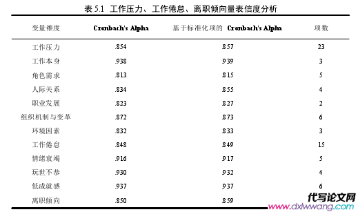 雖然在前期對量表進行了一次預檢驗,但是由于調查對象的擴大,應對三個量表再次進行信效度檢驗。本文利用 SPSS20.0 對正式調查中所采用的工作壓力、工作倦怠、離職傾向量表進行 Cronbach's Alpha 系數信度分析。如表 5.1 所示,工作壓力、工作倦怠、離職傾向的 Cronbach's Alpha 系數都在 0.8 以上,而且其各個維度的 Cronbach's Alpha系數也均在 0.8 以上,則驗證該三個量表均具有較好的信度。由此可見,工作壓力量表中 23 個題項可以分為 6 個因子,其中,1~3 題測量工作本身的壓力,4~8 題測量角色需求壓力,9~12 題測量人際關系所帶來的壓力,13~14題測量職業發展所帶來的壓力,15~20題測量組織機制和變革所帶來的壓力,21~23 題測量環境因素所帶來的壓力,提取因子與預設維度一致。