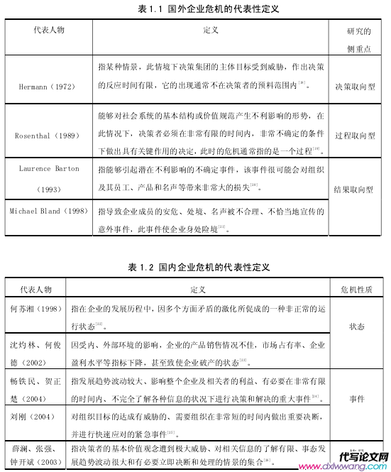 至于企業危機的概念,多年來學者們對其進行著不同的詮釋,而且提出了不同的理論觀點。學者們不同的理論觀點受到其個人立場、所處環境等多方面因素的影響,國內外具有代表性的觀點詳見表 1.1 和表 1.2。