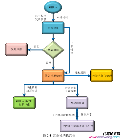 營業稅是指對在我國境內提供勞務,非捐贈性轉讓無形資產和不動產征收的以營業額為基礎,乘以各行業相應稅率所應繳納的稅種。但上述營業稅概念是 2011 年“營改增”政策推行之前的定義,在今天看來已經不合乎現狀,本小節主要目的在于比較稅收政策改革之前營業稅與增值稅的定義和區別,因此仍然沿用以前的營業稅定義。營業稅的稅收管轄部門是地方稅務機關,因此營業稅收入地方政府的主要收入來源。營業稅作為一種流轉稅,其征收范圍十分廣泛,征收環節層層相扣,計算方法比較簡單。建筑業在“營改增”之前按照 3%的稅率征收營業稅。但是營業稅的主要缺點是容易造成重復征稅,忽略企業本身的成本,以總營業額為基礎計算應納稅額,容易增加企業負擔,現代國際社會上的發達國家已經相繼棄用營業稅,改征增值稅能更好的反映公平與效率的稅制原則。營業稅納稅流程如 2-1 圖所示。