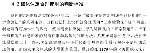 立法模式是法律框架的一個有機組成部分,其他國家關于版權合理使用的立法大致分為要素主義模式與規則主義模式兩類。要素主義模式通常采用歸納的方法來規制版權合理使用。規則主義模式通常采用羅列的方法來規制版權合理使用。前者的優點是相對靈活和順應新情形的能力相對強些,可是在實務中也存在不太好操作、變化太過任意的缺點。后者通常對版權合理使用的認定標準沒有明顯的確定,確定的合理使用類別雖然讓執法人員能夠輕易理解并掌握,可是面對新問題時缺乏變通的應對措施,致使其沒有辦法順應新技術的進步。因此,這兩種模式都存在著一些問題,如何在既能保證合理使用確定性和穩定性的前提下兼顧靈活性與包容性,使我國的合理使用制度規則制訂更加理性和科學。筆者認為,我們可以統籌兼顧,以規則的方法為主,遇到例外的情形就使用要素的方法。即“列舉+兜底”式的立法,在列舉適用合理使用條款的幾種具體情形的基礎上,加入抽象的標準和原則作為兜底的條款或概括的規定。當現實尤其是信息網絡傳播中出現列舉的具體情形之外的新情況如網頁快照時,法官可以通過兜底的條款或概括的規定來加以判斷,從而增強法律的適應性,前瞻性和控制力。如北京高院頒布的《關于審理涉及網絡環境下著作權糾紛案件若干問題的指導意見(一)(試行)》第 13 條[44]直接將符合合理使用標準的網頁快照提供行為認定為構成合理使用就很具有前瞻性。