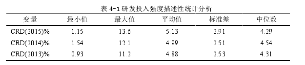 為了對所選 30 家企業 2013-2015 年研發投入情況有一個比較清晰直觀的了解,本文考察了其 3 年來平均數、極值等指標的變化,結果如下表所示:由上表可知,河南省上市高新技術企業的研發投入強度在逐年穩步提高,從2013 年的 4.88%上升到了 2015 年的 5.13%,增幅為 5.07%。增幅雖然不多,但是仍然是一個好的趨勢。我省企業逐步明白加大研發投入力度是十分必要的。近三年來企業研發投入強度最大值 13.6%,在我省經濟相對落后的情況下,這已經是一個很大的數值了。但是最小值只有 0.93%,個體企業間差距很大,國際上通常認為低于 1%就是比較難以生存了。近三年來我省 30 家企業研發投入強度均值都在 5%左右,處在一個中等的水平,與國際上認可的有競爭力的 5%的水平近乎吻合。企業的 Tobin’s Q 值最低僅為 0.93,最高可以達到 8.472,相差 9 倍,企業投資回報率有很大的差距。從市場角度來看,有些企業被投資者看好,有些企業幾乎被市場遺忘。權益報酬率最高可以達到 14.35%,是最小值得 37 倍,猶如云泥之別。這說明,30 家企業利用股東投入資本獲取利潤的能力有較大的差別。資產負債率的平均值為 35.36%,并不是很高,意味著河南省上市高新技術企業整體負債水平適中,企業可以較好的發展下去。從企業性質的均值為 0.233 可以看出,說明河南省上市高新技術企業中以民營企業為主,國有控股企業較少。從另一點也說明了政府想要提高當地的科研水平,促進經濟發展,應該根據實際情況,加大力度扶持民營高新技術企業。