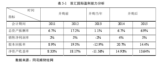 現代企業財務管理目標是企業價值最大化,而對企業價值目標的計量是離不開相關財務指標的。本文分別從盈利能力、營運能力、償債能力和增長能力四個方面選取不同的指標對雙匯國際并購績效進行評價。盈利能力對企業的成敗起決定性作用,不僅對企業近期,甚至長遠而言都會有很大程度作用。盈利能力強,企業價值就會增加,從而導致企業現金流水平越強,最終企業的融資和負債能力也會跟著上升。所以,盈利指標是評價財務狀況的首要指標。反映企業盈利能力的指標有很多,但是基于雙匯國際所處行業的的特點,本文選取總資產報酬率、銷售凈利率和股本回報率來評價雙匯國際并購后的盈利能力。從盈利指標來看,收購成功之后當年,也就是 2013 年公司的整體盈利能力并不樂觀,主要表現為總資產報酬率、銷售凈利率、股本回報率和凈資產收益率四個指標均呈現大幅度的下降,尤其是后三個指標直接表現為負值。2013 年總資產報酬率降低,表明資產效益不是很好,說明并購當年沒有及時的整合,經營管理不到位,影響了整個企業的獲利能力。2014 年其狀況才有明顯改變,到 2015年持續呈現回升狀態。由于雙匯國際收購史密斯菲爾德是通過大量舉債完成的,導致并購當年凈利潤為負值,所以銷售凈利率、股本回報率和凈資產收益率都為負值。經過并購之后的有效整合以及企業生產經營的順利實施,2014 年開始各指標值均出現回升趨勢,股本回報率甚至超過了并購前的數值,可以看出,股東投資人的收益相對于并購前有所上升。