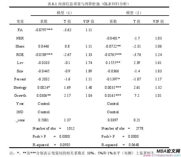 本文使用鄭石橋(2008)和趙靜(2012)計算預算松弛的方法對假設 1 進行穩健性檢驗,將預算松弛帶入模型(1)和模型(2)的右端進行回歸,回歸結果如表 6-1 所示。模型(1)的 F 值在 1%的水平上顯著,R-squared 為 0.09,模型(2)的 F 值在 1%的水平上顯著,R-squared 為 0.065,模型可以較好解釋回歸結果。模型中各個變量的方差膨脹因子 VIF 均小于 2,說明在模型中各個變量之間不存在多重共線性。業績預測準確性的回歸系數為-0.8797,在 1%的水平上顯著負相關,沒有因差錯而導致財務報告重述的回歸系數為-0.0481。在 10%的水平上顯著負相關,說明在其他條件一定的情況下,內部信息質量越高,預算松弛程度越低,驗證了假設 1。因此,穩健性的檢驗結果與上述回歸結果基本一致。