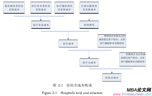 醫院成本支出范圍由《醫院會計制度》和《醫院財務制度》規定,這兩項制度由衛生部和財政部聯合頒布。根據核算目的的差異性,醫院成本可以分為醫療業務成本、醫療成本、醫療全成本和醫院全成本。院內各級成本構成如圖 2-1 所示。1)醫療業務成本是指醫院為了向患者提供醫療服務而發生的一系列直接或間接的耗費。包括各項基本醫療成本支出,不含財政補助收入和科教項目收入形成的固定資產折舊、無形資產攤銷和庫存物資等。醫療業務成本=臨床服務類科室直接成本+醫療技術類科室直接成本+醫療輔助類科室直接成本=臨床、醫技、醫輔類科室(人員經費+衛生材料費+藥品費+固定資產折舊費+無形資產攤銷費+提取醫療風險基金+其他費用)2)醫療成本是指醫院為開展醫療服務活動,各業務科室和行政后勤各部門自身發生的各種耗費。不含財政項目補助支出和科教項目支出形成的固定資產折舊、無形資產攤銷和庫存物資等。