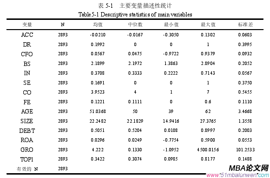 表5-1顯示的是本文涉及到的上市公司 2010年至2016年度各個研究變量的描述性統計結果,具體內容包括各個變量的最大和最小值、中位數和均值等。由表 5-1 顯示,應計項目(ACC)的均值為-0.0210,中位數為-0.0167,平均值小于中位數,這說明 ACC 的分布是左偏的,可見我國大部分企業是存在穩健性的,并且其穩健性水平高于平均水平。其最小值為-0.3050,最大值為 0.1302,它們之間相差 0.4352,說明各個公司間會計穩健性的水平有著較大的差異,這可能與公司具體的經營情況有關。隨著經濟不斷的發展,競爭越來越激烈,企業要想更好的生存,就得披露高質量的信息來保障公司利益相關者的利益,所以越來越多的企業意識到會計穩健性的重要性,開始注重公司的會計穩健性水平,他們希望公司能夠平穩快速的發展。CFO 表示總資產平減后的經營活動現金流量,其均值為 0.0567,中位數為 0.0475,均值大于中位數,說明 CFO 是右偏的,均值為正表明企業在這一期間的經營活動現金流量為正,最大值為 0.9379,最小值為-0.9722,最大值和最小值的差距較大,可見不同的公司其現金流量存在較大差異。DR 的中位數是 0,表明很大一部分企業的現金流為正。