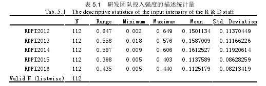 本節通過 SPSS22.0 軟件對樣本數據進行描述性統計分析,以對樣本數據進行初步了解。從表 5.1 中我們可以看到,研發團隊投入強度 2012-2016 年的最小值分別是0.002、0.018、0.009、0.005、0.005;最大值分別是 0.649、0.576、0.606、0.403、0.440;均值分別為 0.150、0.159、0.161、0.114、0.113。從均值角度可以看到從2012 年到 2014 年研發人員投入強度在逐年增大,在 2015 年形成斷層,可能是由于 2015 年前有部分公司沒有披露研發人員數量,以技術人員代替,而技術人員除包含研發人員外還包含其他人員,導致比正規研發人員投入強度數據略大。從最大值和最小值來看,2012 年、2013 年、2014 年、2015 年最大值分別約是最小值的 324 倍、32 倍、67 倍、81 倍、88 倍,這說明制造業各企業間對于研發人員投入強度的差距很大,對研發活動的重視程度差別很大。