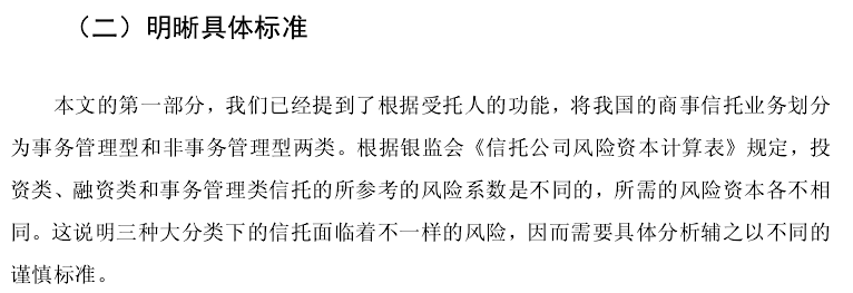 大陸法系的信托制度多源自英美,由于基礎制度的缺乏,法律移植較為粗糙。而我國的信托制度多從日本、韓國和中國臺灣等大陸法系國家和地區間接引入,在制度規則上更加失去體系性與合理性46。謹慎義務的 7 標準本身是一個開放的規則體系,社會經濟的發展和市場規則的完善,層出不窮的新經濟態勢都會不斷對受托人提出新的謹慎要求。面對日新月異的資本市場,首先需要確立統一的一般標準作為原則性的導向。其次,針對不同信托類型需要予以不同的標準衡量:在大部分的通道業務中,信托公司只承擔事務管理類職責,起通道作用,因而可課以較低的謹慎義務標準;在投資類信托中,一般不設預期收益,兌付風險相對偏小。組合投資理論在此可以發揮分散風險的作用,因而是否盡到謹慎義務關注點在于投資時的風險考量與規避;而融資類信托是兌付風險的重災區,謹慎投資標準應關注于融資項目的盡職調查、審慎推介和其后的信息披露階段。最后,標準完善,責任機制應當跟進。通過責任機制的完善,司法可預期的警示作用,反向強化受托人的風險控制與謹慎投資意識。