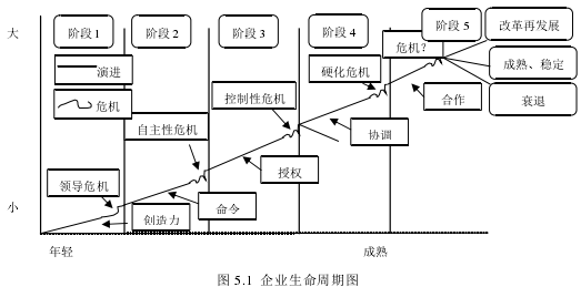 企業要實現可持續發展觀念就必須先創新,觀念創新要求管理者的經營理念和經營思想要領先時代。觀念創新對企業管理創新起先導作用,如果一個企業的管理者堅持傳統的管理思維,企業的創新就無從談起,特別是對中小家族企業更是如此,在前章分析中國家族企業的人情化管理、狹義的產權觀念等都嚴重阻礙中小家族企業的管理創新。如果中小家族企業還是堅持原來的管理思想,必將阻礙其發展,甚至破產。HY 公司主要從以下幾種觀念進行創新。在不同的生命周期,一個企業在不同的發展階段都會產生不同的問題和挑戰,企業生命周期圖見圖 5.1。 從圖 5.1 可知,企業的生命周期有 5 個階段,相對應的是嬰兒期、學步期、青春期、壯年期和蛻變期等五個時期,與每個時期對應的都有危機。這些危機產生的原因,有像市場、資源和技術等外部因素;也有像企業成長中產生的矛盾、生產設備更新以及人才流動等內部因素。企業要發展就必須解決這些問題。目前 HY 公司處于“學步年輕成熟期”的家族企業,從 5.1 可以知道,HY 公司實行的是高度集權化的家長式領導,而產生的是自主性危機。在這個階段,HY公司的管理層要洞察外部環境變化,同時也要面對內外部挑戰,用長遠發展的戰略眼光,對公司主動地實施計劃、分步驟管理創新變革,這樣才能使 HY 公司向企業生命周期中更高層次發展。