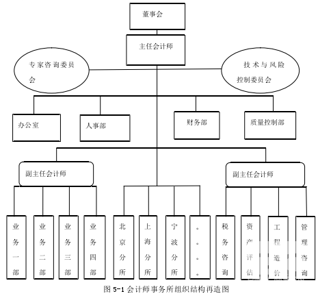 首先我們知道企業的組織結構是指企業的全體員工為實現企業目標而進行的分工協作,并在職務范圍、責任、權利等方面所形成的結構體系。其主要目的是指揮和協調組織成員的行動以實現組織的目標。合理的組織結構是會計師事務所的長遠發展的前提,組織結構的好壞直接影響著企業組織內部的資源配置,是企業人流、資金流、物流和信息流得以正常流動的基礎,最終影響著企業組織行為的效能和效率。因此,要想有效地進行戰略實施,必須首先建立適合其戰略的組織結構。 ZQ 會計師事務所目前采取的是直線職能結構,管理層下面多部門是并列分布的,管理層次簡單清晰,這會給管理層造成壓力,這種組織結構設置不科學。首先對 ZQ 會計師所事務所的業務進行分塊,主要包括三塊,一是傳統的審計鑒證類業務;二是像管理咨詢等類新興業務;三是下面的分所。由于管理層壓力比較大,所以我們在傳統的審計鑒證類和管理咨詢類業務上分別另設一個副主任會計師負責這一塊的業務,有效減少主任會計師的直接壓力。在主任會計師下面設立技術與風險控制委員會,負責事務所的信息技術和風險控制體系的評價和管理。這樣把業務類似的歸為同一個部門,再另設一個監督控制委員會,相互分工,易于管理和協調,也合理地分擔了管理層的壓力,這樣的組織結構是和 ZQ 事務所發展戰略相適應的。