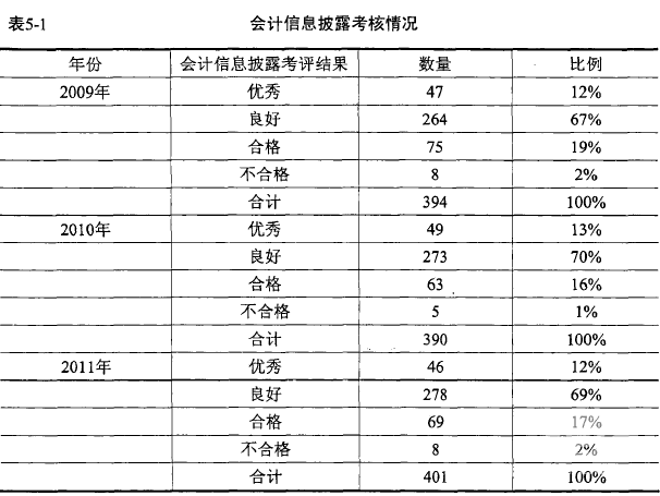 從表中可以看出,2009年至2011年這三年會計信息披露考評結果相差不大,各等級所占比例情況較為穩定。其中評級為良好的企業占據比例最大,三年均在70%左右,其次是評級為合格的企業,占據18%左右,再次是優秀的企業,占據12%左右,而不合格的企業占據比例最小,三年均不超過2%。雖然,信息披露評級為不合格的企業最少,但是并不能說明信息披露的水平較高,因為評級為優秀的企業也并不多,只占十分之一,上市公司的信息披露質量尚且有很大的進步空間。