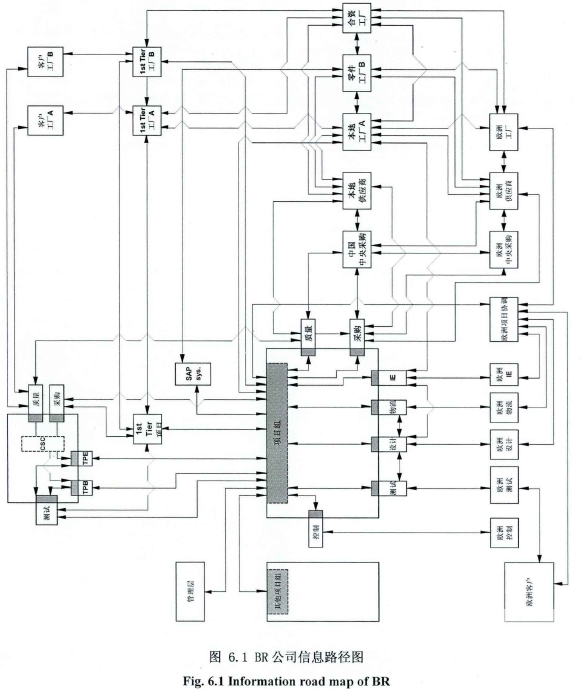 如圖中所示整個供應鏈體系都被涵蓋在整張圖中。從縱向角度看這張圖包括了從下游的客戶,一階供應商到BR公司項目團隊到下游供應商。從橫向角度看客戶端包括中國客戶和歐洲客戶以及相應的總裝廠,BR公司同樣也包括中國項目組、歐洲協調人和相應的工廠,同時還包括了平行的其他項目和數據系統。另外這幅圖還表明了項目組織的構成關系,比如圖中的中國項目組就是有項目經理、銷售、質量、IE、設計、測試、物流以及釆購等等的職能部門成員組成的。圖中的每一條連線都代表了一個業務關系,在每個業務關系的兩端就是項目干系人(這里SAP系統也屬于項目干系人)。根據這些連線就可以識別到對應的項目干系人,根據每條信息路線又可以確定出具體的業務流程。
