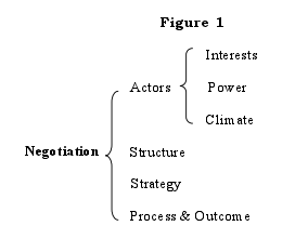Negotiation is a system consisting of four basic elements: actors, structure, strategy andprocess and outcome. The process here means the stages or episodes of negotiation. (Ghauri &Usunier: 1996) See the following figure 1.