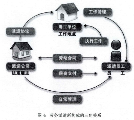 可見,勞務派遣是一種“人”與“才”的實際使用權和所有權相分離的新型勞務關系,由此構成了勞務派遣機構與勞務派遣工之間、勞務派遣機構與實際用工單位之間、勞務派遣工與實際用工單位之間的復雜關系(詳見圖4)。