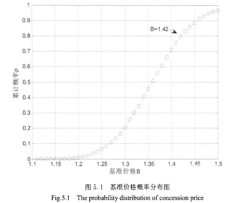 在Matlab7.O中建立本文第3章提出的模擬模型,求解可得特許價格的概率分布如圖5.1所示,假設取置信水平p為0.8,則基準價格應取B二1.42,3種車型的收費價格應分別定為(25.4,42.6,56.8)元。