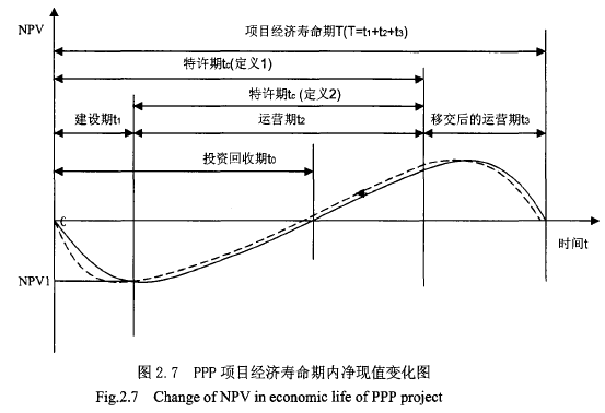 ?從PPP項目的經濟壽命期凈現值變化圖2.7來看,對于建設期完工風險較小或一般的項目,采用第一種方式定義特許期有利于激勵私營部門抓緊項目建設,以獲得更長的運營期、縮短投資回收期、提高特許期內的項目凈收益;對于完工風險較大的項目,私營部門一般不愿意承擔這種風險,此時宜采用第二種定義方式