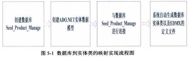 ?種子生產流程信息管理系統涉及到數據的錄入、修改、查詢、刪除等操作,這些操作都需耍通過訪問數據庫來實現,而一般系統中數據庫的存取主要依靠的是創建連接,取數據,將數據保存到自己創建的類中這樣一系列的流程,但是本系統采用了EF實體架構的思想。從數據庫映射到實體類的工作流程圖如圖5-1所示。