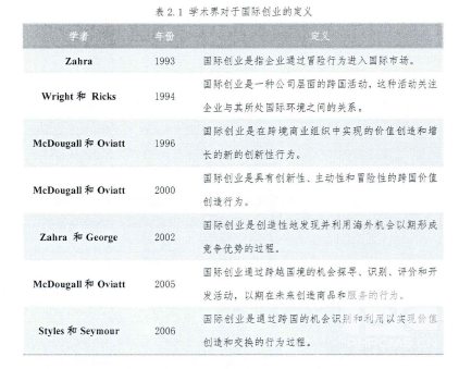 國際創業領域的研究,最早可追溯到20世紀80年代,Morrow于1988年率先提出了 “國際創業”這一概念,而McDougall (1989)首先對其進行了定義:“國際創業是指從成立初就開展國際化運營的國際新創企業的發展過程。”此后,隨著更多的學者參與到相關研究中,對于國際創業的定義也不斷豐富(如表2.1),研究的范疇也進一步明確。McDougall ( 1989)通過對新創企業海外銷售活動的實證研究,首次揭示了國際新創企業與傳統企業之間的區別。Zahra (1993)隨后提出,國際創業的研究對象應該同時包括新創企業和成熟企業。在Wright和Ricks (1994)對于國際創業的定義中,公司年齡或者國際化時點不再是界定國際創業的唯一標準,同時他們還認為年輕的新創企業和成熟企業都具有研究的價值。他們強調了企業環境對于激發特定創業行為的重要作用,并且將創業行為的跨國比較也納入到了國際創業的研究范疇。McDougall和Oviatt (2000)對于國際創業的定義回歸了Miller(1983)對于創業的定義,即強調了國際創業是公司層面的一種具有創新性、主動性和冒險性的行為。這使得對于國際創業的研究可以借鑒并延續創業領域的某些研究成果,同時也將大企業創業(Corporate entrepreneurship)包括在國際創業的研究范疇中。Zahra和George (2002)借鑒創業領域的研究成果(Shane和Venkataraman, 2000; Zahra和Dess, 2001),首次從創業機會的視角定義了國際創業,將國際創業視為企業通過對海外創業機會的識別、開發和利用以實現國際化的過程。他們還指出過去的國際創業研究過于專注國際新創企業,而對于成熟企業開展的跨國創業行為缺少關注。他們認為正是由于企業創業行為和國際化過程之間的交叉,特別是企業在國際化過程中所采取的創新性和冒險性行為,使得國際創業成為了獨立于企業國際化的特殊研究領域。借鑒他們的視角,McDougall和Oviatt在2005年重新定義了國際創業,提出國際創業的實施對象并不應局限于國際新創企業,也包括成熟企業,同時,更加明確了國際創業中的“創業”特征,強調了對“機會”關注,從而與傳統的企業國際化研究相區別,并明確提出國際創業的研究應包括兩個方面的內容:對于企業“創業型”國際化的研究(Entrepreneurial internationalization)和對于創業活動的跨國比較研究(Comparative studies of entrepreneurship across national borders)。