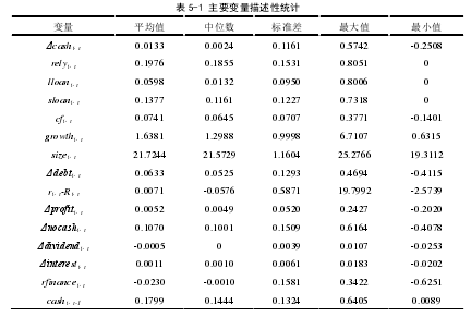 表 5-1 報告了研究主要變量的描述性統計結果。表 5-2 為國有企業與非國有企業的主要變量均值和中位數差異。我們發現企業現金變動(Δcashi,t)均值和中位數分別為0.0133 和 0.0024,標準差為 0.1161。由此看出,各個企業現金變動差異較大,現金持有量總體呈上升趨勢,現金持有政策大不相同。國有企業現金變動的均值為 0.0226,中位數為 0.0075,而非國有企業現金變動的均值為 0.0004,中位數為-0.0075,均值檢驗和中位數檢驗都顯示國有企業比非國有企業現金變動更大。企業對銀行依賴度(relyi,t)均值為 0.1976,企業對長期銀行依賴度的均值(lloani,t)為 0.0598,而企業對短期銀行依賴度(sloani,t)的均值為 0.1377,說明企業對銀行貸款的依賴主要通過獲得短期貸款,這可能是因為企業申請銀行貸款的時候,由于較少獲取擔保(潘紅波等,2010),加之債權人保護較弱的法制環境(孫錚等,2005),導致銀行更傾向發放短期貸款。在分組為國有和非國有企業后,我們發現不論是長期銀行依賴度還是短期銀行依賴度,國有企業都受到了銀行的偏愛。股票超額回報率(ri,t-Ri,t)均值為 0.0071,偏離了 0,這是由于數據處理剔除了異常值使其偏離了 0,而中位數為-0.0576,表明大多數企業的股票回報率低于行業平均水平,分組后顯示國有企業的回報率低于非國有企業。企業現金持有水平(cashi,t-1)最大值為 0.6405,最小值為 0.0089,表明現金持有量最高占資產總額的64.05%,最低占資產總額的 0.89%,分組后顯示國有現金持有水平顯著低于非國有現金持有水平。此外,國有企業在規模(sizei,t)方面顯著勝于非國有企業,但是在代表盈利能力的指標上,現金流量(cfi,t)確顯著低于非國有企業,然而在代表融資能力的指標上,利息費用的變動(Δinteresti,t)和籌資額的變動(rfinancei,t)顯著高于非國有企業。
