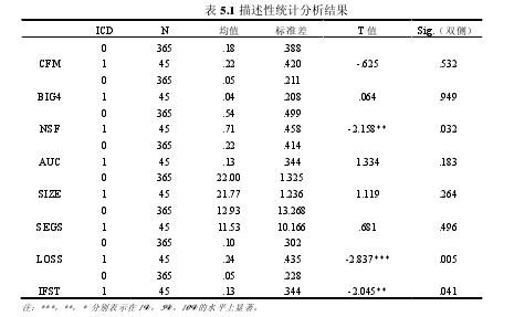 為了檢驗所選取的變量的顯著性,對各個變量的均值進行了 T 檢驗,表 5.1 列示了檢驗的結果。本文對 T 檢驗的結果做了具體的分析:本文所選取的三個自變量董事長與總經理的兼任情況(CFM)、是否是“四大”事務所(BIG4)、是否納入實施范圍(NSF)中,只有是否納入實施范圍(NSF)這個變量的 T 值通過了顯著性檢驗,并且方向與預期的一致,即越是納入實施范圍的公司,其披露財務報告內部控制缺陷的概率越大;其余兩個變量的 T 值均沒有通過顯著性檢驗。在本文所選取的控制變量中,營業利潤(LOSS)和是否 ST(IFST)這兩個控制變量的 T 值通過了顯著性檢驗,并且符號與預期的一致,說明了當公司經營狀況不佳時,其內部控制出現漏洞的可能性更大。其余的自變量和控制變量的 T 值并沒有通過顯著性檢驗,具體原因將在后文的Logistic 回歸結果的分析中給出。T 檢驗只是對假設的初步檢驗,具體的應該看最終的邏輯回歸的結果。通過表格可以看出,本文所選取的虛擬變量:是否 ST(IFST)、是否是“四大”事務所(BIG4)、是否納入實施范圍(NSF)、事務所變更(AUC)、營業利潤(LOSS)、董事長與總經理的兼任情況(CFM)的初始取值全都都發生了變化,即原來的 0 改用 1 表示,原來的 1改用 0 表示。記住這個分類對后面的回歸結果的分析非常的重要,因為我在讀文獻的過程中發現許多學者在他們的研究中把這一點給忽略了,導致了結果的分析錯誤,即 T 檢驗的結果和 Logistic 的結果相互矛盾,這點是我們在以后的研究中應該注意的。