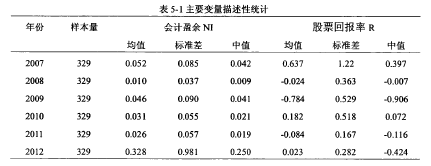 主要變量分年度的描述性統計如表5-1所示,可以看出:(1)會計盈余各年的巾值均小于均值,表示NI是右偏的;(2)股票回報率各年的中值也是小于均值的,表示股票回報率也是右偏;(3)同一年度來看,2007年會計盈余的標準差0.085小于股票回報率的標準差1.22; 2008年會計盈余的標準差0.037小于股票冋報率的標準差0.363;2009年會計盈余的標準差0.090小于股票回報率的標準差0.529; 2010年會計盈余的標準差0.055小于股票回報率的標準差0.518; 2011年會計盈余的標準差0.057小于股票回報率的標準差0.167;只有2012年會計盈余的標準差0.918小于股票回報率的標準差0.282:說明相對丁?會計盈余來說,股票回報率的波動性更大。圖5-1顯示了會計盈余和股票收益率2007-2012年度趨勢圖。圖中顯示,股票收益率有較大波動2007年為最高點為0.637,然后一路下滑,跌至2009年的谷底-0.784后開始回升,但一直處于波動狀態。上市公司會計盈余較為穩定,2007-2011年比較平穩,2012年升至趨勢由2011年的0.026升至2012年的0.328。