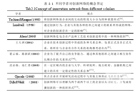自從上個世紀 90 年代創新網絡概念提出以來,眾多學者從不同的的視角對創新網絡進行了研究,取得了很多重要的成果。其中一個比較具有代表性的就是期刊“Research Policy” 中關于“創新者網絡”(networks of innovators)的內容,這一??瘜撔戮W絡的研究成果介紹的比較詳細。隨后,國內外學者開始從資源、技術、組織行為等角度對創新網絡展開大量研究,并在研究過程中從不同視角界定創新網絡的基本概念,如表 2.1 所示。在總結各位學者對企業創新網絡的理解的基礎上,本文將企業創新網絡定義為焦點企業在開展創新活動的過程中,與客戶、供應商、大學、科研院所、政府部門、科技服務機構等外部合作伙伴形成的各種關系總和。這里的焦點企業指的是能成為研究對象的且在網絡中有重要作用的企業。它可能是處在核心位置的企業,它的角色具有不可替代性,焦點企業一般成長較為迅速,在網絡中起著主導的作用。它同時也是網絡中行為主體的關鍵所在,一般情況下,焦點企業可以通過自身的屬性以及其在整個網絡結構的核心位置取得較大的優勢,它具有將網絡中較為分散資源進行匯集的能力,也具備選擇優秀伙伴的能力。任何一種性質的企業,在某種認知范圍內,都是可以形成以自我為中心的創新網絡。采用這種定義的原因主要有兩個:第一,從焦點企業認知視角去研究創新網絡,可以使我們得到的結果和提出的建議更加具有實踐的指導意義和現實可操作性。第二,與創新網絡中的其他成員相比,焦點企業對各種創新活動更加了解,所以對外部創新往往能做出更加客觀真實的評價和判斷,有利于我們更加細致的了解創新網絡創新績效的影響。