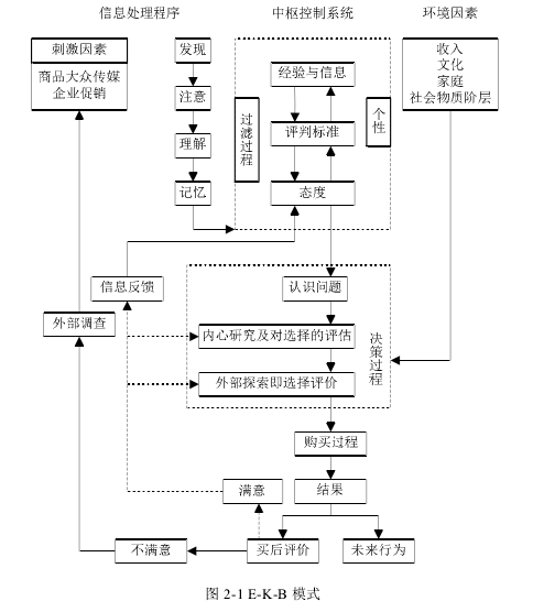 E-K-B 模式是消費者理性購買決策行為理論中由 Engel,Kollat 和 Blaekw 三人于 1968 年提出,后多次修改,消費者做出理性購買行為可以分為五個階段:(1)問題認知。問題認知產生于消費者的理想狀況和實際狀況存在差異的情況下。(2)收集信息。當消費者認知問題存在后,便會去尋求此問題的相關信息。(3)方案評估。在收集到所需的信息之后,消費者便根據所得到的信息去評估各個方案的可行性。(4)選擇。在各種可能的方案被評估后,消費者便會選擇一個最佳方案并采取購買行動。(5)購買結果。產品或服務被使用之后,消費者最終可能發生滿意或購買認知失調兩種結果,并將其存儲于記憶當中(Engel,Kollat,Black Well,1984)。對于該模式的詳細解釋如圖 2-1 所示: 第一階段:問題認知。問題認知是 E-K-B 模式的第一步。其產生由外部因素與內部因素共同刺激產生,即當消費者意識到現實的狀況與其理想狀況出現偏差時,便產生了問題的認知。此時,整個決策系統便被激活,決策目標也逐漸細化成具體的行動。 第二階段:收集信息。在第一階段的問題認知之后,消費者下一步便是收集先關的信息。同時信息的收集包括內部信息的收集和外部信息的收集兩個部分。所謂的內部信息收集是根據自身的實踐經驗或者以往已經存在的一些原始資料;而后者則指通過大眾媒體、銷售人員以及親朋好友等渠道所收集的相關信息。當消費者無法通過內部信息搜尋滿足信息方面的需求時,便會試著通過外部信息渠道進行相關信息的搜尋。而是否使用外部信息搜尋是由消費者自身對于產品的利得和成本的權衡決定的。