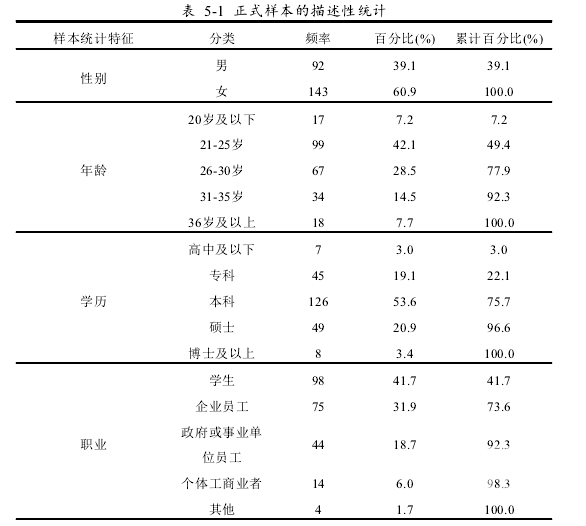 利用 SPSS 對受訪者年齡、性別、學歷、使用經驗、通訊費用等進行描述性分析,結果如下表: 從上表可以看出,與預測試樣本不同,正式樣本個統計特征的分類更廣,說明正式問卷的樣本多樣性較好。其中女生的比例是60.9%,本科學歷占了53.6%。年齡層在21-30歲之間占了大部分,達到了70.6%,說明本次調研的樣本普遍是年輕人,對4G交易類移動商務的接受能力更強。每月可支配收入1001-3000元占了67.7%,每月平均移動通信消費支出在51-100元之間的有70.6%,說明在移動通信上的消費較為理性。從未用過4G交易類移動商務業務的有35.3%,使用過的有64.7%,使用過4G交易類移動商務的人數較多,可以有效的回答關于該業務的題項。在使用過該業務的人中,每月平均使用次數未滿1次的最多,占了35.7%,與預測試結果不同,對運營商來說,增加使用次數是一個現實問題。在一次消費中能夠接受多大額度的交易金額101-500元之間的最多,有44.3%,使用中國移動的人數最多,達到了89.4%,與中國移動占的市場份額相符。
