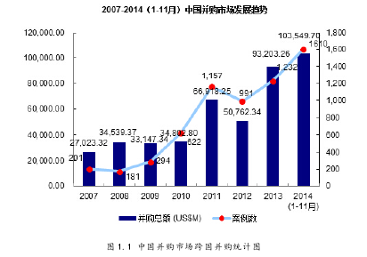 現代企業的發展主要通過內部成長和外部擴張兩張方式,這兩種方式比較而言,外部擴張更具有時間和成本上的優勢,能夠在短期內迅速擴大企業規模,實現規模效應。因此,并購作為企業外部擴張的主要途徑,對促進企業優化資源配置和實現規模經濟方面有著重要作用。隨著經濟全球化和國家“走出去”戰略的推廣,從 2013 年開始,我國跨國并購事件就日益頻繁發生。據統計,截至 2014年 11 月,我國市場共發生 164 起跨國并購事件,同比增長 47.7%,其中披露金額的事件有 143 起,涉及的并購交易額共 340.84 億美元,同比下降 22.7%。1下圖統計了我國并購市場 2007 年——2014 年跨國并購的案例數和交易總額,可以看出 2013 年在交易金額規模方面出現了大幅增長,主要是由于我國國內市場趨于飽和,企業“走出去”和資本輸出已成為必然趨勢。而 2014 年金額規模方面較 2013 年出現了小幅下降,究其原因在于我國企業雖然急于開拓海外市場,獲取先進技術和吸收高素質人才,但是法律、文化、管理等方面的差異使得并購后 期的整合問題困難重重,因此跨國并購活動在 2013 年的跨越式增長之后規模開始趨于謹慎。 從并購行業分布來看,2014 年我國并購市場共發生了 1610 起并購事件,分別發生在房地產、機械制造、生物科技、電子設備、礦產及能源、IT 等二十多個行業。其中由于 2014 年有些地區房市不景氣、房價出現下跌趨勢,房地產行業業內加速洗牌,導致房地產行業發生并購事件最多,有 166 起居第一,在總數中占 10.3%;然后機械制造行業緊隨其后,位居第二,共發生 144 起,總占比達8.9%。22014 年 7 月,就《上市公司重大資產重組管理辦法》、《上市公司收購管理辦法》證監會向社會征求修訂意見,此舉對于上市公司產業升級和行業整合,以及推動并購市場的發展有重要作用。在此背景下,我國部分上市公司為了應對市場的激烈競爭和產能過剩問題,積極并購新興行業達到跨界轉型的目的,從而實現市場價值和業績的增長。