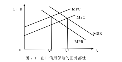 對外部性理論的定義,現在還沒有統一說法,經濟學家們主要從產生主體和接受主體這兩個角度對外部性進行定義。出口信用保險可以幫助投保企業保障風險、降低損失、獲得利益,同時出口信用保險還可以促進整個國民經濟發展,增加就業,整個社會都會從出口信用保險中受益。所以,正外部性是出口信用保險的一大特征。具體體現為出口企業投保出口信用保險得到的受益比出口信用保險為整個社會帶來的受益要小,另一方面,針對經營管理出口信用保險的機構來說,由于賠付率較高,保險機構付出的成本高于其所得受益。所以,出口信用保險在不僅在需求方面存在正外部性,而且在供給方面也存在正外部性。出口信用保險在需求和供給兩個方面的正外部性分別導致了有效需求和有效供給不足。 從圖 2.1 中我們可以分析出,在出口企業購買出口信用保險時,出口企業得到的受益為 MPR,付出的邊際成本為 MPC,社會從中得到的邊際受益為 MSR,社會付出的邊際成本為 MSC,比較看出個人邊際受益小于社會邊際受益,個人邊際成本大于社會邊際成本。市場均衡時 MR=MC,我們可以得出,出口企業消費出口信用保險的均衡量為 Q1,而社會的均衡產量為 Q2,Q1