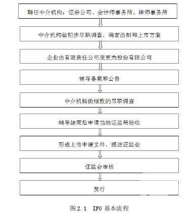 首次公開募股(Initial Public Offerings,簡稱 IPO):指股份制公司第一次的、向社會公眾公開的出售股份,從而籌集資金的發行形式。IPO 大致的流程如下圖所示:IPO 基本流程說明:第一步是由擬上市公司邀請中介服務機構擔任職務——證券公司(俗稱“券商”)、會計師事務所以及律師事務所,它們的職責分工是這樣的——其中券商的任務是擔保、推薦、銷售,會計師事務所的工作是進行相關審計業務,律師事務所擔負著上市過程中所涉及到的法律問題;接著中介機構在公司的合作下對公司的文檔資料、任職人員背景材料、所面臨的各類風險等做初步盡職調查并且確定改制和上市方案;接著由有限責任公司改變體制成股份有限公司;與券商簽訂輔導協議后去所在地的證監局進行存檔備查,接著在所在地登報公開接受輔導的備查檔案;中介機構進場做細致的盡職調查,對公司的各個方面進行調查,發現存在的不規范的方面,提出整改建議,直到向證監會報送上市申報材料;待輔導結束后就可以申請當地證監局按照一定的標準進行檢驗采納;在盡職調查后形成上市申請文件,主要是招股說明書等,報送中國證監會;之后由證監會以一定的流程對文件資料進行審查核實,審核的過程是復雜而有序的,分別由不同處室在相互協調和相互制約的基礎上完成的,如果證監會審核不通過,則不可以發行股票;審核通過后進行首次公開發行。