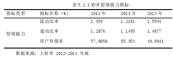 托賓 Q 值是企業市場價值與其重置價值之比,從股票市場角度反映了企業管理層的經營業績水平。分子上的數值代表企業在金融市場的價值,分母中的數值代表了企業的實際價值。當托賓 Q 值>1 時,適合企業進行資本投資活動,購買資本產品;當托賓 Q 值<1 時,則表示進行現成的產品投資更有利于企業,進而會減少企業的資本需求。本案例研究王府井并購前后的財務指標變化,是以王府井并購當年為分界點。兩企業正式完成合并到現在的時間只有一年,所以本文選取的僅是 2014 年的數據,即并購后的一年。評價上市公司并購是否成功要以真實的財務指標為標準,本文選取如下指標來評價王府井是否并購成功:如流動比率、速動比率、資產負債率等債務指標,總資產周轉率、流動資產周轉率、存貨周轉率營運指標,凈資產收益率、銷售凈利率、銷售費用率、管理費用率等盈利指標、主營業務收入增長率、凈利潤增長率以及凈資產增長率等發展能力指標。為了保證研究數據的可靠性,避免某個指標的偏差,我們選取 13 項關鍵的指標,分析這 13 項指標的變化趨勢,來綜合考慮企業的財務狀況。