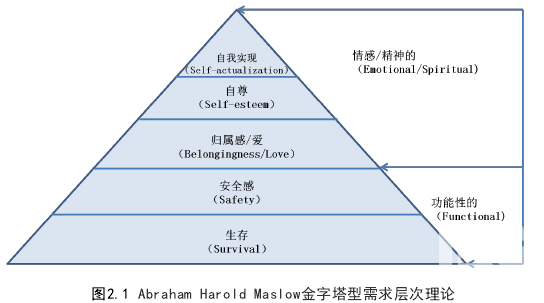 用戶體驗歸根到底還是一種心理感受,它與用戶消費行為存在著強相關,而談到用戶消費行為則不能不提馬斯洛的需求層次理論。美國心理學家 AbrahamHarold Maslow(1943)在《人類激勵理論》論文中提出人類需求象階梯一樣從低到高按層次分為五種,分別是:生存需求(survival)、安全需求(safety)、社交需求—歸屬感/愛(Belongingness/Love)、尊重需求(Slef-esteem)和自我實現需求(Self-actualization)。 功能性的底層需求相對較為基礎和穩定,而用戶體驗屬于情感/精神層面的需求,是較高層次的需求。Abraham Harold Maslow金字塔型需求層次理論見圖 2.1?;隈R斯洛的需求層次理論,李小青(2010) 在《基于普遍心理分層理論的Web 用戶體驗模型設計》的論文中提出了基于用戶心理研究的WEB用戶體驗模型。其認為人們認識事物要經過本能層、行為層和反思層的處理過程。本能層的用戶體驗與感知系統相聯系,正如用戶“本能”,這部分是最直接最原始的用戶感受。因此與網站展現給用戶的最表層的視覺設計和界面設計關聯。行為層的用戶體驗與網站的交互設計和功能設計關聯,顧名思義,與用戶在使用網站時的相關行為有關,表現為以用戶目標為驅動的一系列的用戶行為。反思層的用戶體驗位于模型的最高層,并不直接接收身體感知系統的信息輸入或實施行為的直接控制,需要基于本能層和行為層的調整和固化形成,在較長一段時間內具有穩定性,是本能層和行為層體驗的累積,一般情況下不會因為一次交互體驗就發生較大程度的改變。