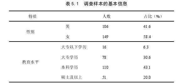 通過對回收的問卷進行剔除和統計,共獲得 255 份有效問卷。本次調研中,在發放調查問卷時,為確保被調查者如實填寫問卷,保證數據的真實有效,采取了匿名的方式進行。