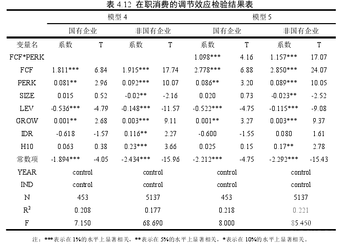 (2)基于不同所有權性質下自由現金流與在職消費關系的研究表明:在非國有企業中,自由現金流與在職消費顯著正相關,這一結果與學者陳紅明(2005)等的觀點基本一致[67]  ,而在國有企業中,二者相關關系并不顯著。對于非國企業而言,內部留存的自由現金流越多,可能會一定程度影響管理層在職消費的動機,特別是在自由現金流充足的企業,其管理層可能出于激進的心理,更容易產生在職消費的欲望。而在國有企業中,由于實行的薪酬管制,內部管理層在進行在職消費時并不會過多的考慮企業內部是否有充足的自由現金流,故國有企業的自由現金流并不會對管理層的在職消費產生作用。