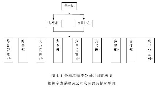 北京金泰港物流有限公司(以下簡稱金泰港物流公司),注冊成立于 2010 年 11月,注冊資金 6000 萬元,由北京金泰集團有限公司全資設立。北京金泰集團有限公司(以下簡稱金泰集團),注冊資本 9.15 億元,致力于做最卓越的城市服務運營商,權屬單位 89 家,在北京城區擁有 342 個經營網點資源,經營范圍主要包括現代物流、燃料經營、旅游飯店、物業經營與管理、汽車銷售、超市、廚房設備、機械加工等多個領域,經營區域分布在北京市城區及房山、門頭溝、延慶、大興等區縣,“十二五”期間收入已經逾 100 億元,目前正在努力向“百年金泰、幸福金泰”發展。金泰港物流公司主要經營鋼貿物流、國際/國內貿易以及倉儲租賃等業務,致力于打造一流的現代化國際物流園區,目前已經吸引了普洛斯、廣州本田等優質客戶入住。 目前金泰港物流公司所提供物流服務基本上都是傳統的物流服務模式,比如:鋼材倉儲、裝卸搬運等常規的物流服務,其余的基本上以場地、庫房租賃為主,在實際物流運營中沒有提供物流增值服務,對于公司發展現代化物流來說還處于起步階段。具體見圖 4.1 金泰港物流公司組織架構圖。
