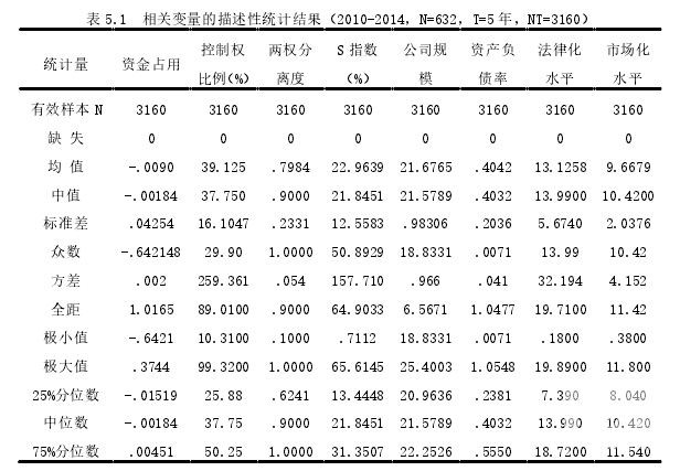 本文主要變量的描述性統計結果如表 5.1 所示,我國家族上市公司終極股東的掏空行為存在很大的差異,說明終極股東可能會在受到各類因素的影響下對公司做出不同程度的掏空行為。 通過表 5.1 可以發現,我國家族上市公司終極股東的控制權比例的區間跨度非常大,從 10.31%到 99.32%,均值為 39.13%,中位數為 37.75%,說明全部樣本中有 50%以上的終極股東的控制權在 37.75%以上,說明我國家族上市公司的股權比較集中,家族上市公司的終極股東有對上市公司的資產掏空和侵占中小股東及外部投資者的動機和能力。而第二至第十大股東的持股比例之和的均值僅為 22.96%,說明我國家族上市公司的第二至第十大股東的持股比例較小,對終極股東的制衡作用也較為薄弱。家族上市公司的兩權分離度的均值為 0.7984,表明在我國家族上市公司中,終極股東的控制權與現金流權分離現象嚴重,終極股東有對上市公司的資產掏空和侵占中小股東及外部投資者的動機和能力。 在利益掏空方面,資金占用水平的最小值為-0.6421,最大值為 0.3744,均值為-0.0090,中位數為-0.00184,說明全部樣本中有 50%以上的終極股東對家族上市公司實施了掏空行為。我國家族上市公司中,終極股東對上市公司的資金占用現象較為嚴重。  在資產負債率方面,雖然均值 40.42%較為正常,但是可以看出我國家族上市公司的資產負債率差異很大,有些公司甚至超過了 100%,可能會存在嚴重的掏空行為。 公司規模的標準差為 0.98,說明我國家族上市公司的公司規模的差距較小。 我國的省市自治區非常多,在市場化水平和法律化水平方面差距也非常大,法律化水平均值為 13.13,市場化水平均值為 9.67,整體來說我國在市場化和法律化的建設方面還需要加強和完善。