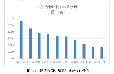 筆者主要通過“中國裁判文書網”進行案例檢索,對全國租賃合同糾紛案件進行檢索、篩選與統計。筆者在“中國裁判文書網”中以“租賃合同”作為檢索關鍵詞,便于囊括所有與租賃合同相關的案件;將裁判文書選擇為僅包括“判決書”,排除了裁定書、決定書,有助于更準確的定位租賃合同案件中的實體問題,篩除與實體問題無關的程序性問題;考慮到“中國裁判文書網”的開通時間2,同時也是為保證檢索結果的時效性,筆者將時間范圍限定為 2013 年1 月 1 日至 2015 年 12 月 31 日;在案由方面,筆者將案由限定為民事案由中的租賃合同糾紛,排除了僅在判決書全文中涉及租賃合同但并非屬于租賃合同糾紛的案件。此外,為保證筆者的檢索能夠全面客觀反映我國租賃合同糾紛案件的整體情況,筆者沒有對法院層級進行限定,法院層級中包括了最高人民法院、各高級人民法院、各中級人民法院以及各基層人民法院。通過以上檢索筆者共檢索到案件 113190 個。筆者共選取了三個角度對檢索結果進行分析:案件地域分布、案件案由分布、原告身份比例,從不同的側面總結租賃合同糾紛案件的基本情況。從租賃合同糾紛案件地域分布來看,我國租賃合同糾紛案件顯現出分布不均衡的現象,65.31%的租賃合同糾紛案件集中分布在十個區域:江蘇省、浙江省、北京市、廣東省、山東省、上海市、河南省、河北省、四川省以及遼寧省,其中江蘇省和浙江省更是典型的租賃合同糾紛頻發地區,分別占據了租賃合同糾紛案件的 11.3%和 9%。不難看出,這些地區均為經濟較為發達的地區,越是經濟發達的地區越涉及到租賃關系的建立,而大量的租賃關系的建立必然引發大量租賃法律關系的產生,從而導致租賃合同糾紛案件數量的攀升。經濟較為落后的中部或偏遠地區如黑龍江省、山西省、青海省以及海南省,租賃合同糾紛案件數量較少,分別僅占總案件數量的 0.7%、0.65%、0.37%和 0.36%。