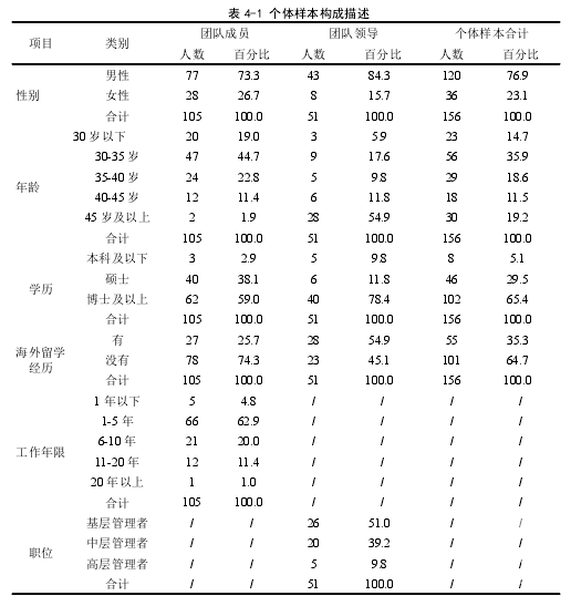本研究采用方便取樣的方法向陜煤、西安交大、西北大學、陜西師范、西安科技大學、西北化工研究院 6 家單位 56 個團隊的團隊領導和成員共發放紙質和電子版問卷 130 份。刪除有明顯反應偏向、沒有回答完整的數據,得到 51 個有效團隊共 102 份有效問卷,問卷有效率為  78.46%。通過表 4-1 可以看出,被調查者中男士的比例較大,特別是領導團隊中,男性的比例高達 84.3%,從側面反映了男士從事科研活動的比例偏高,從事科研活動并當上領導的比例更高,這與現實情況相符。從團隊個體的年齡構成來看,科研團隊的成員年齡偏小,40 歲以下占到 70%,這與近年來國家鼓勵科技創新和高校擴招政策呼應。在學歷構成方面,團隊成員的碩士比例為 38.1%,博士及以上達到 59%,說明科研團隊中成員的學歷相對較高,這也為碩士生擴招后就業難的畢業生提供了就業方向——進科研團隊。而在領導團隊中,有博士學歷的比例占到 78.4%,說明在科研團隊中對于科研能力的重視。從受教育經歷來看,有 54.9%的領導都曾到國外留學,說明企業對于科研人員培養的重視,豐富的學識和經歷有利于領導帶領團隊進行科研活動。在被調查的團隊成員中超過 95%的工作經歷達到了一年以上,說明被調查者相對了解團隊的基本情況,填寫的數據更接近與團隊實際情況。