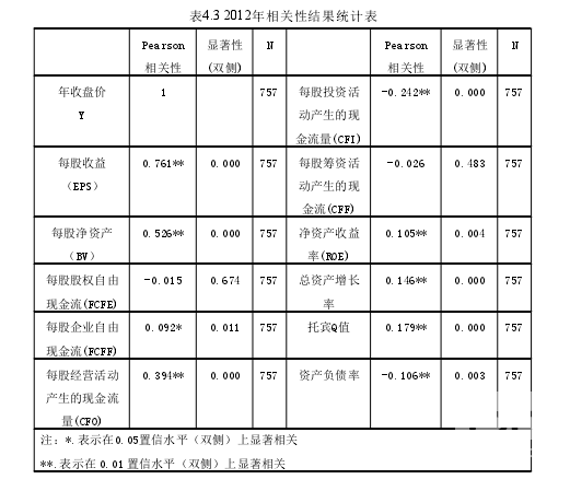 上表是對各變量的描述性結果進行的匯總。從表中我們看到:(1)2011年至2014年股票價格指標,即年收盤價的均值呈現出總體上升的趨勢,雖然在2012年有所降低,但是不影響整體是呈現上升狀態的。從描述性統計結果能夠看出,公司的會計盈余指標的均值呈現出較為穩定的狀態,總體上沒有較大的變動。這都表明上市公司的財務狀況較為穩定,并且總體呈現出良好的發展態勢。而年收盤價的標準差存在一定的波動,說明我國證券市場上股價不是特別穩定。(2)通過對2011年至2014年描述性統計中的均值進行觀察??梢园l現,現金流量中,每股投資活動產生的現金流量均值為負,這是由于公司處在快速發展中,規模不斷壯大、生產能力逐漸增強,投資活動的支出必然增大,表現為投資活動的現金流入大于現金流入。1并且企業的自由現金流均值和股權自由現金流的均值也都為負,說明本文研究的757家公司,在年末整體都沒有現金可以分給股東。(3)2011至2014年間,各項財務指標的均值較為平穩,沒有很大的起伏,表明研究的757家企業財務狀況良好,沒有重大的變動。并且在上表中,我們沒有發現解釋變量與被解釋變量的相關性,至少從數據上看,沒有明顯地同步變化。但單從數據的表象看沒有同步趨勢,不能代表其不具有相關性,還應該對其進行進一步的相關性研究。