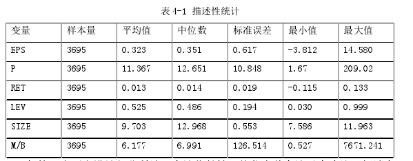 本文的原始研究樣本采用的是最近五年即 2010 年至 2014 年我國滬市 A 股資本市場上全部的上市公司。然后根據以下原則對原始樣本進行了剔除: (1)剔除掉數據不全的公司; (2)剔除掉選用期間被特別處理(ST)和特別轉讓(PT)的公司; (3)剔除掉選用期間首次發行股票的公司; (4)剔除掉金融類的公司。 經過以上的剔除,739 家上市公司符合要求,共得到完整的樣本 3695 個。本文中所使用的數據均來源于銳思數據庫,經濟景氣指數的數據來源于國家統計局。所用統計軟件為 STATA 12.0。 如第三章研究設計部分所述,會計穩健性,就代表著會計盈余確認“壞消息”比“好消息”更加及時,其中“壞消息”指損失,“好消息”指收益。如果出現會計盈余的均值小于中位數的情況,這種左偏傾向就證明了會計穩健性的存在。從上表 4-1 我們可以看出,RET 、EPS 和 P 的均值都比中位數小,表現出了左偏傾向。根據以上的描述性統計結果,我國上市公司整體上存在會計盈余穩健性。