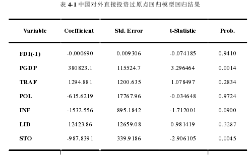 根據現有的文獻,中國由于其特殊的經濟、政治、文化背景,其對外直接投資活動往往是由政府主導,而且表現出特殊性。那么,第三章中我們得到的世界范圍內的企業在中國周邊國家進行投資時,經濟因素所起到的作用是否與中國在這些國家進行 OFDI 時相同呢?為了驗證上述疑問,本章將建立與第三章相對應的面板數據模型,來考察經濟因素對中國 OFDI 的影響。 下面我們針對中國對周邊國家對外直接投資活動進行計量分析。為了便于比較分析,我們仍選取上一章的自變量,即,對外直接投資競爭程度 FDI(-1)、市場規模(PGDP)、經濟開放程度(TRAF)、制度質量(POL)、通貨膨脹率(INF)、國際資本流動風險(LID)、金融發展水平(STO)。因變量選取中國對各國的對外直接投資流量,數據來源于對外直接投資統計公報。