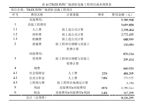 TRZX 購物廣場占地 4.06 公頃,  建筑總面積 54316 平方米,其中,地上40059 平方米,地下 14257 平方米,屬于框架結構,總層高 21 米,跨度小于 70米。TRZX 購物廣場是一座由商業步行街、綜合百貨、大型超市、國際影城、飲食長廊組成的大型城市綠色商業綜合體,位于城市中央景觀大道核心位置。 TRZX 購物廣場按照國家公共場所相關標準建設,建筑分為地上四層,地下一層。地上一層為化妝品、珠寶首飾購物區及大型超市;地上二層為男裝、女裝購物區;地上三層為家居用品、童裝、體育用品購物區以及休閑區; 地上四層為商場影院、餐飲區及員工內部辦公區;地下一層是停車場。 經營部在參考了之前的完工項目的數據和經驗后,確認企業承接該項目不會出現資金問題,再由工程部確認該項目在技術上對公司目前的安裝水平來說沒有技術難點。于 2015 年 4 月 LC 消防設施安裝有限公司決定參與 TRZX 購物廣場工程消防工程項目的競標,由經營部和財務部主導標書的編制,并將標書經過多次修改后交由總經理審批,審批通過后,確定了最終版的標書。2015 年 5 月成功中標 TRZX 購物廣場消防工程項目,  TRZX 購物廣場消防工程項目的合同價款為750 萬元,該項目合同計劃工期為 270 天,具體日期為 2015 年 6 月 1 日到 2016年 2 月 28 日。該項目施工內容主要有:消防自動掃描滅火系統、室內自動噴水滅火系統、氣體滅火系統、火災自動報警系統等。因為該購物中心項目為大型公共場所的消防工程,它的消防安裝涉及到公共消防安全,所以甲方對該消防設施安裝工程的完工質量有著嚴格的要求。 LC 公司承接 TRZX 購物廣場項目后,可以按上一章設計的成本管理體系的流程對項目進行系統的成本管理,分別是預算、計劃、控制、核算、分析及考核。